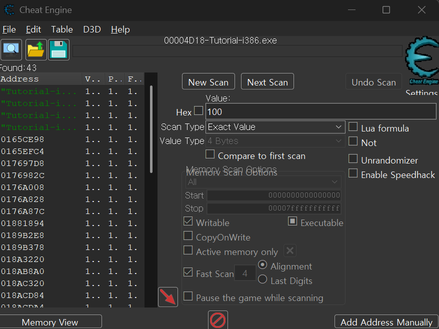 아래 화면은 CE에서 Value를 100으로 입력하고 First Scan을 수행한 모습이다.