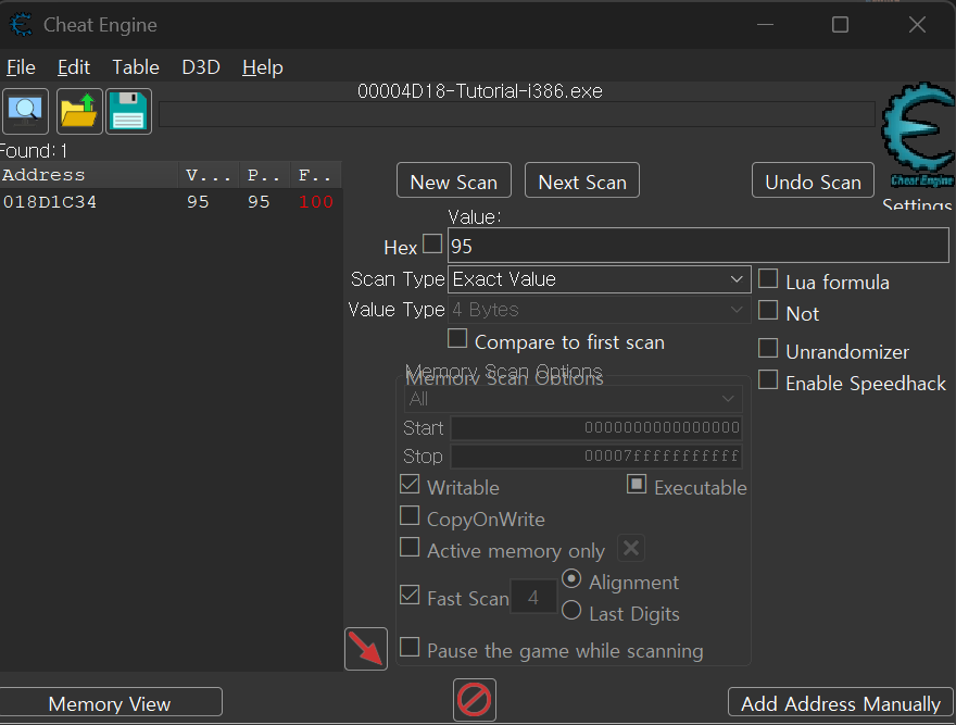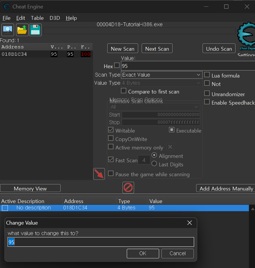 예를 들어 95가 되었다면 CE에서도 검색 값을 95로 바꾸고 Next Scan을 수행한다.